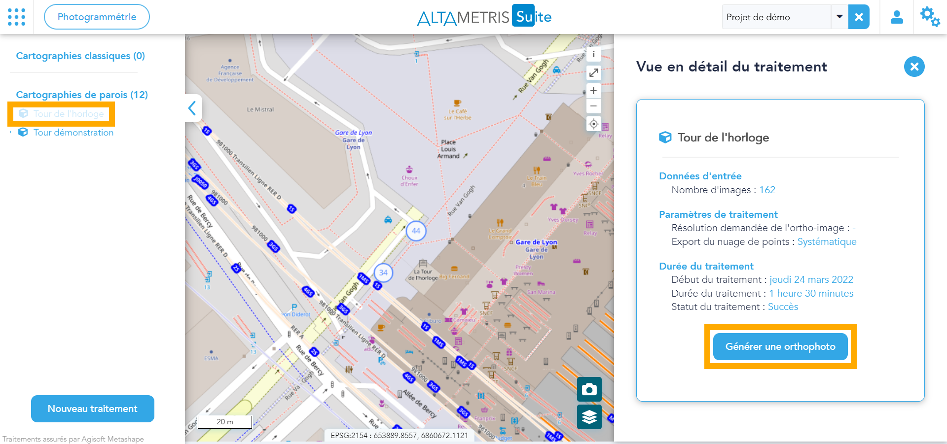 Lorsque vous cliquez sur « Traiter », le traitement se lance et durera potentiellement plusieurs heures en fonction de la taille de vos données. Le résultat apparaitra dans Geoservices une fois le traitement achevé.