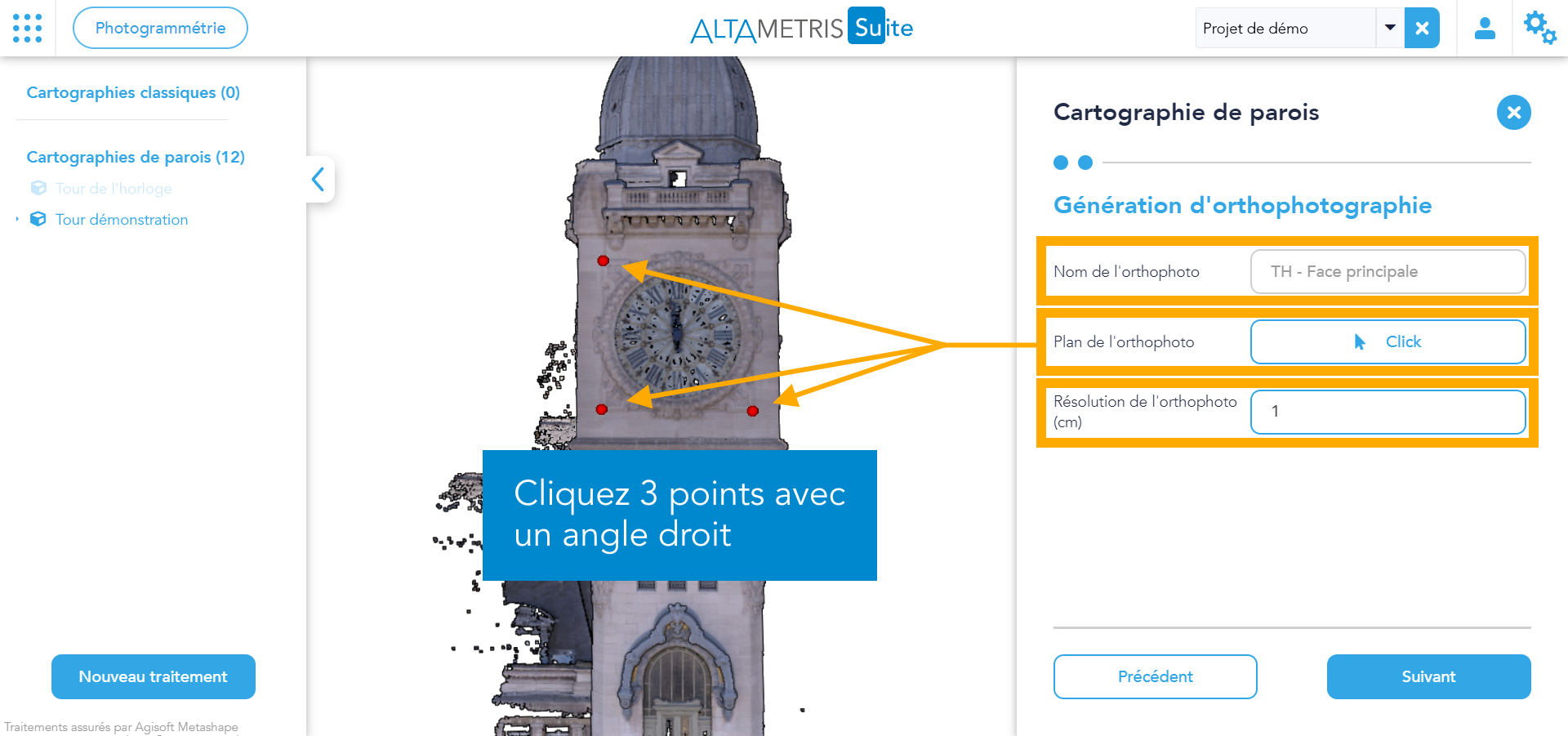 Pour définir l’orientation de l’orthophotographie souhaitée, il est nécessaire de définir le plan de projection. Pour ce faire, cliquez 3 points selon un angle droit sur la face souhaitée.