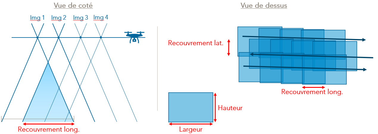 Ces photographies devront représenter la scène dans son ensemble et doivent être acquise depuis divers points de vue. Il est primordial que les photos aient une zone importante de recouvrement. Dans le cas d’une acquisition de photos aériennes orientées vers le bas (nadir), la figure décrit les notions de recouvrement longitudinal et de recouvrement transversal.